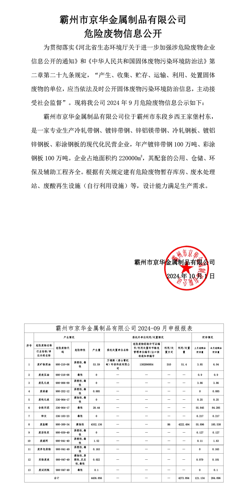 24年9月危險廢物信息公開-霸州市京華金屬制品有限公司